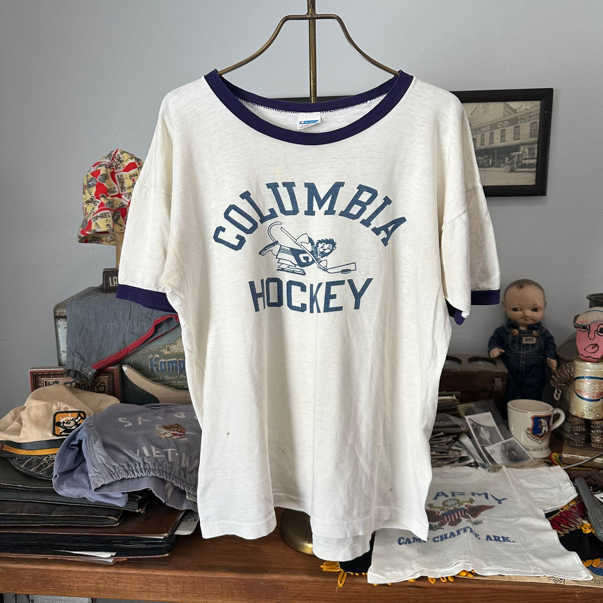 1970’s Columbia Hockey Water Print Champion Blue Bar Ringer T-Shirt Large