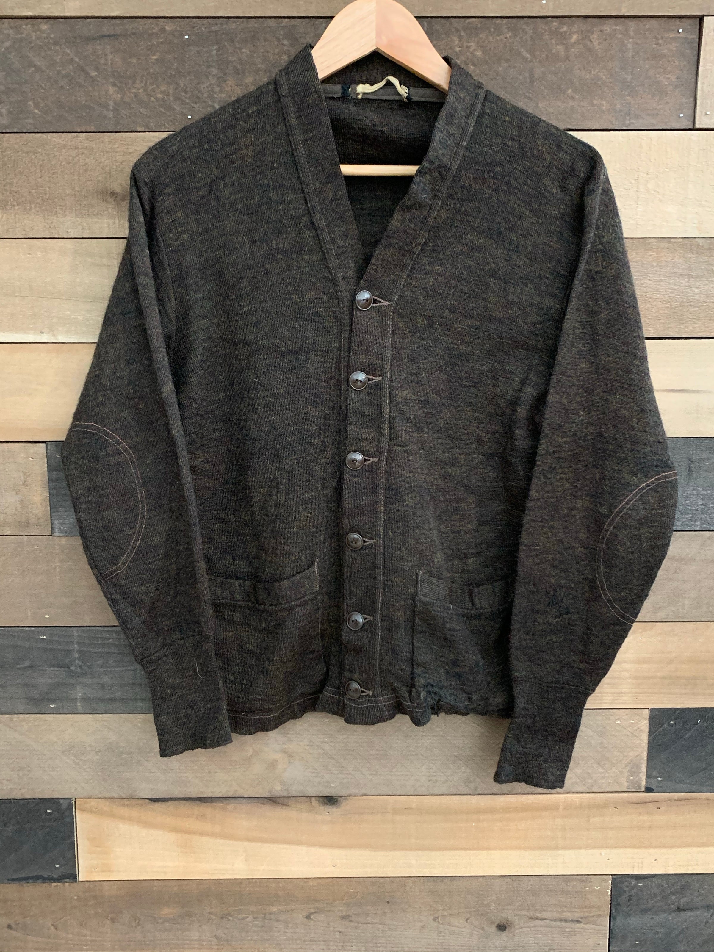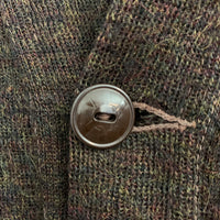 Absolutely impeccable condition for the age. Not a hole in sight. Looks to have been homemade. Heathered wool that’s multi-colored with a brown base and notes of gold, pink, and green. Just insane. Reinforced elbow with pink contrast stitching. Front pockets are my favorite part, I like their shape a lot. Fits like a small.