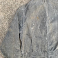 Great look, love the label. Wear all around that is pictured. Tapers around the middle of the coat so fits smaller than you’d think based on measurements. Check pictures and measurements before purchase.