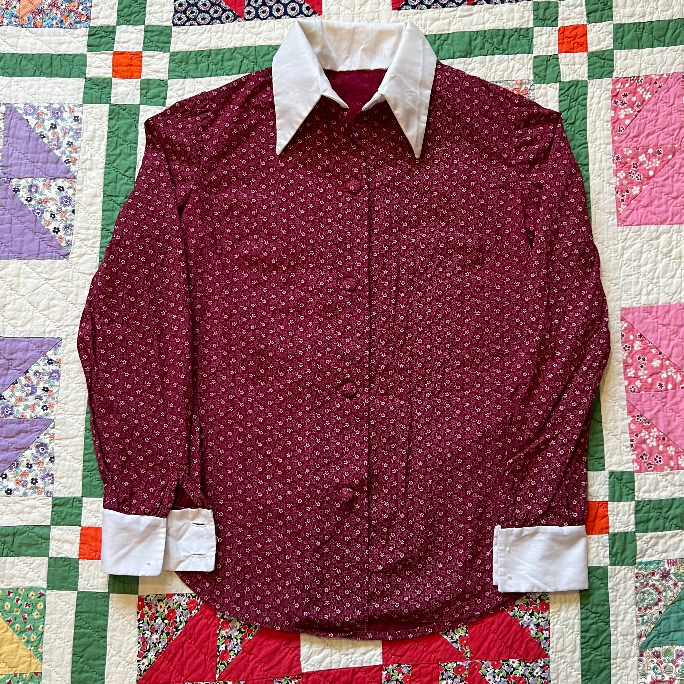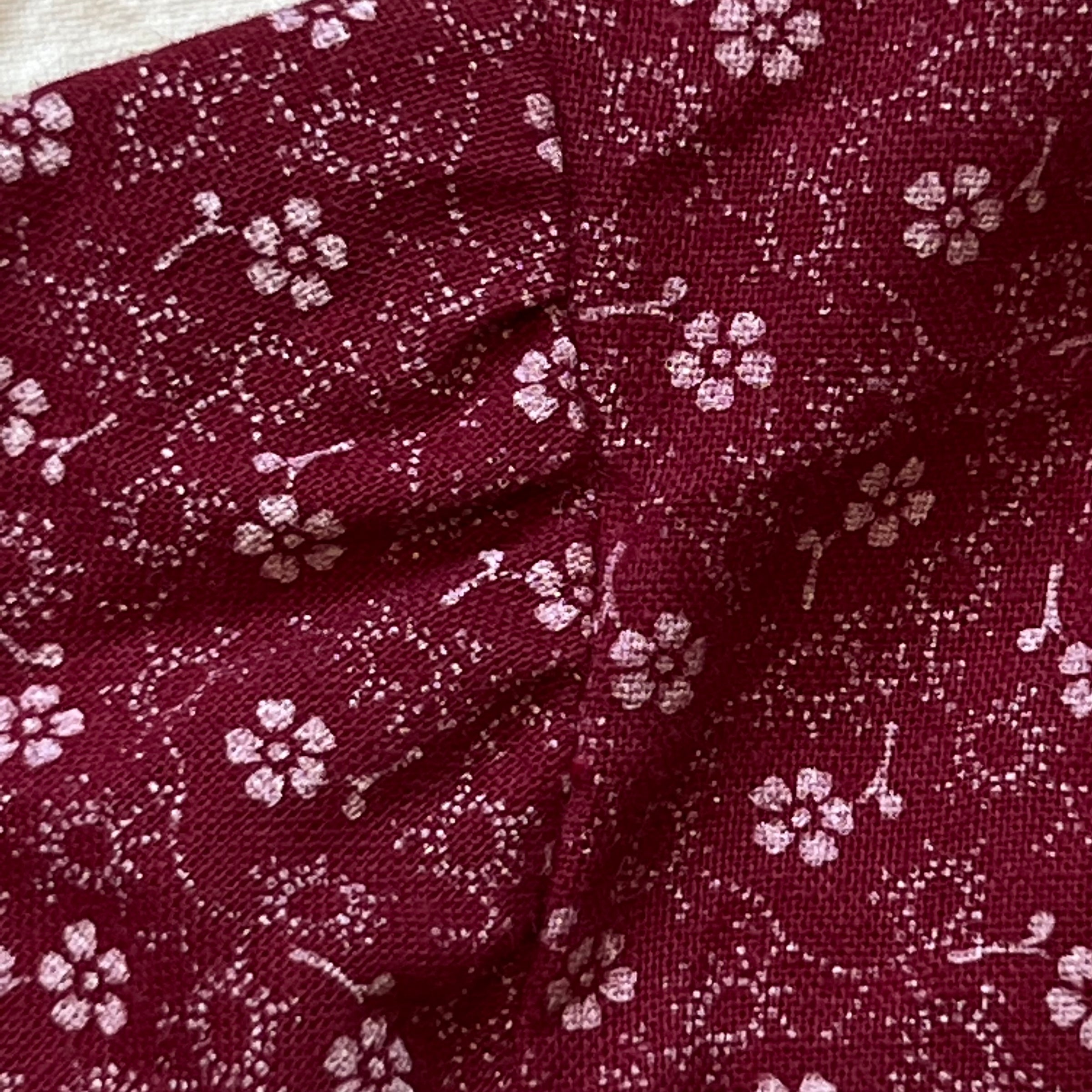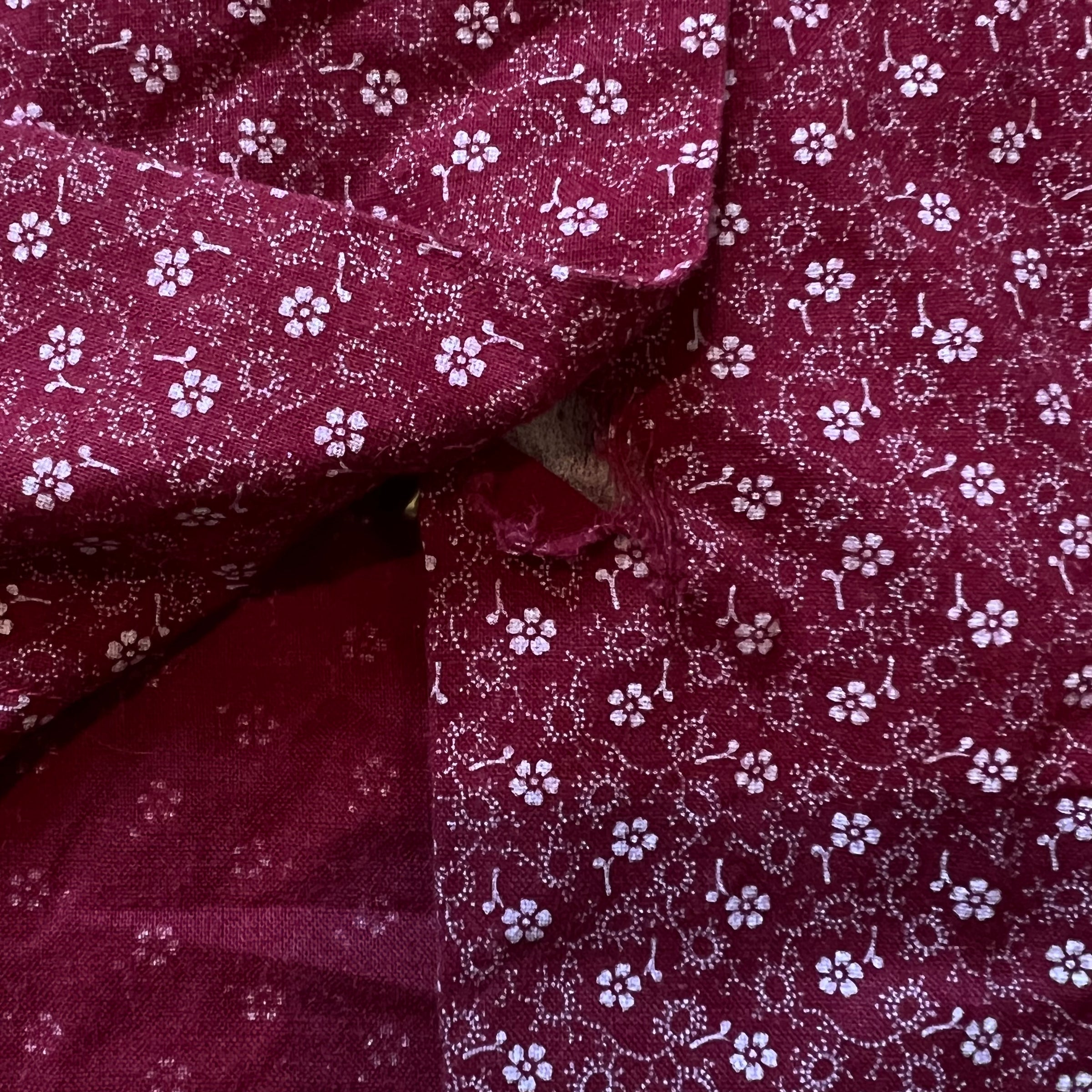 This fabric is just gorgeous. Homemade, most likely during the Great Depression with the calico from much earlier. I believe this is a blouse, has scrunched shoulders. Missing cuff buttons and has safety pins behind the main buttons on the front. Love the contrasting white collar and cuffs against that gorgeous red calico. Fits like an XS, check measurements and pictures before purchase.