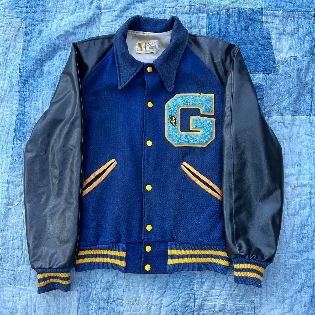 1970's Gill's Eagles Navy Varsity Jacket with Black Leather Sleeves Tagged Size 42 M/L
