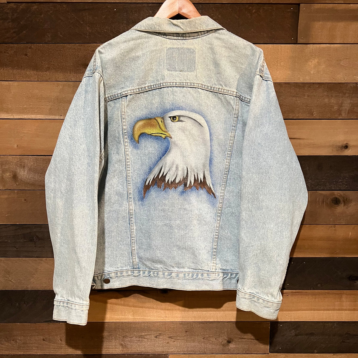 1980's Light Wash Levi's Type 3 Denim Jacket with Airbrushed Bald Eagle XL