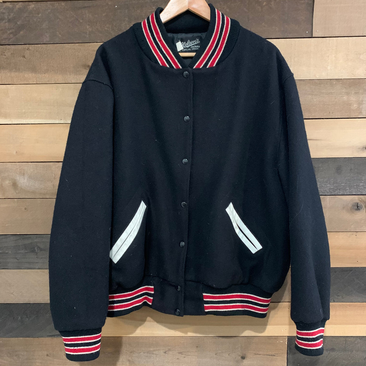 1990's Nelson Black and White Wool Varsity Jacket XL
