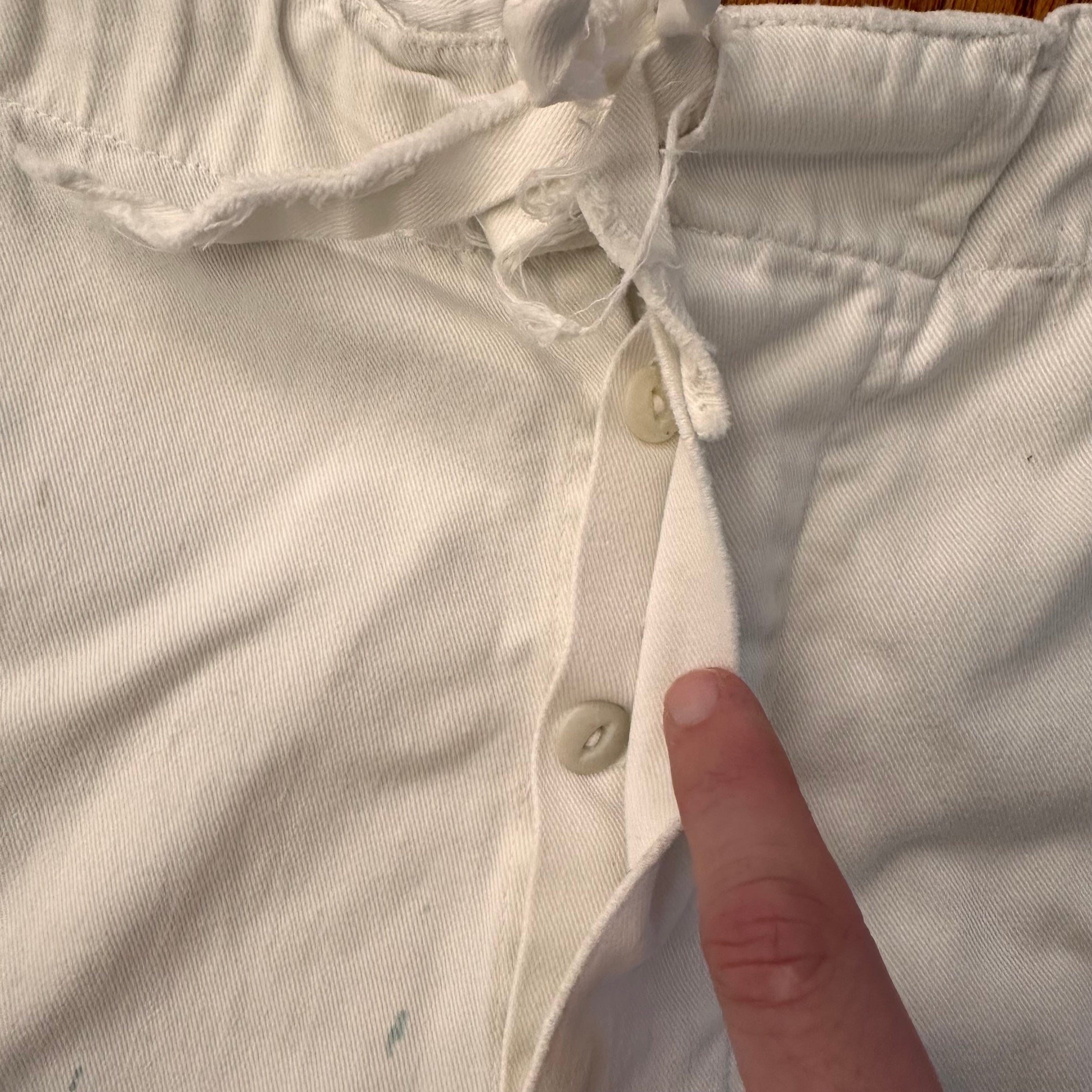 Early stencil, button fly, some paint on them. Unique tied waist situation. Check pictures and measurements before purchase.