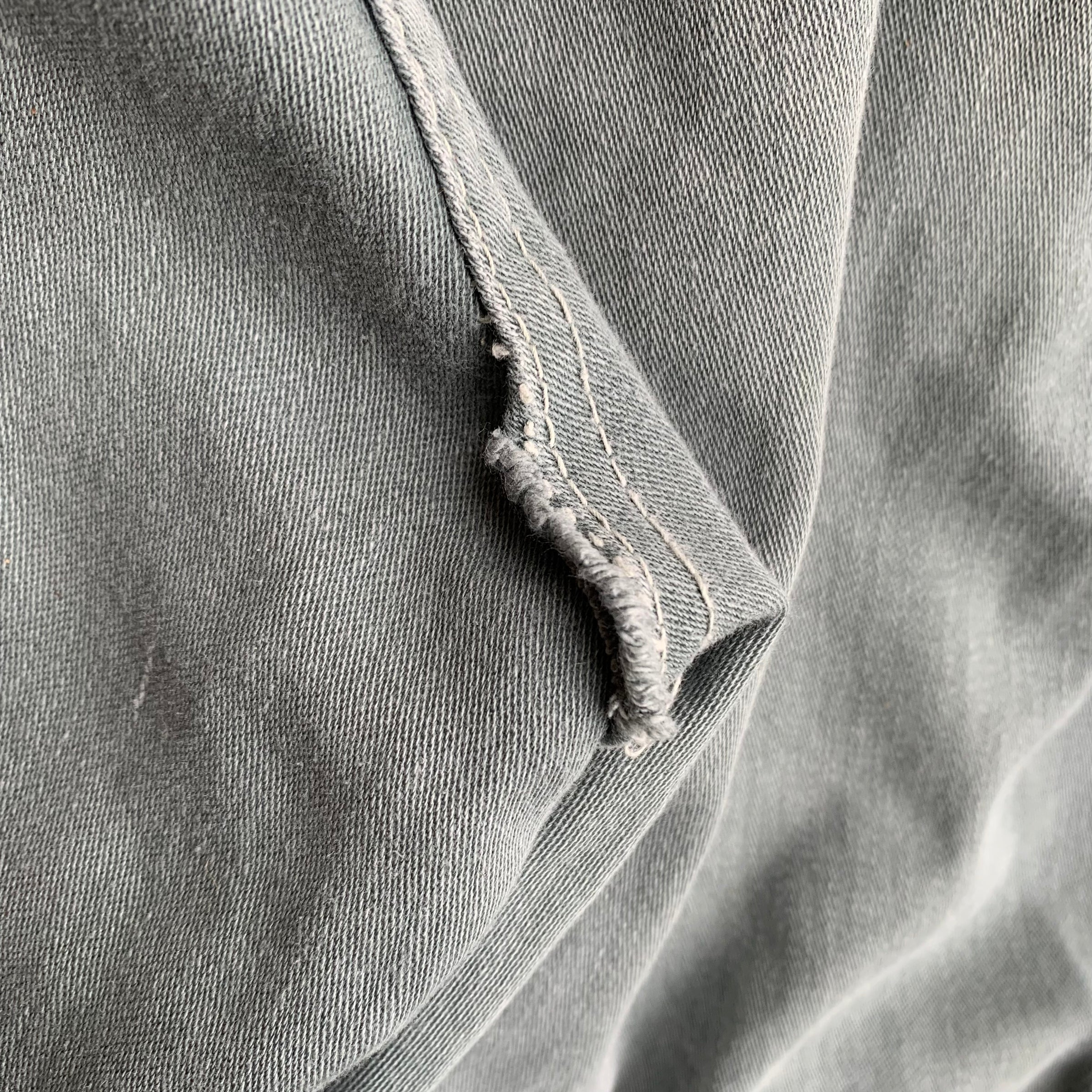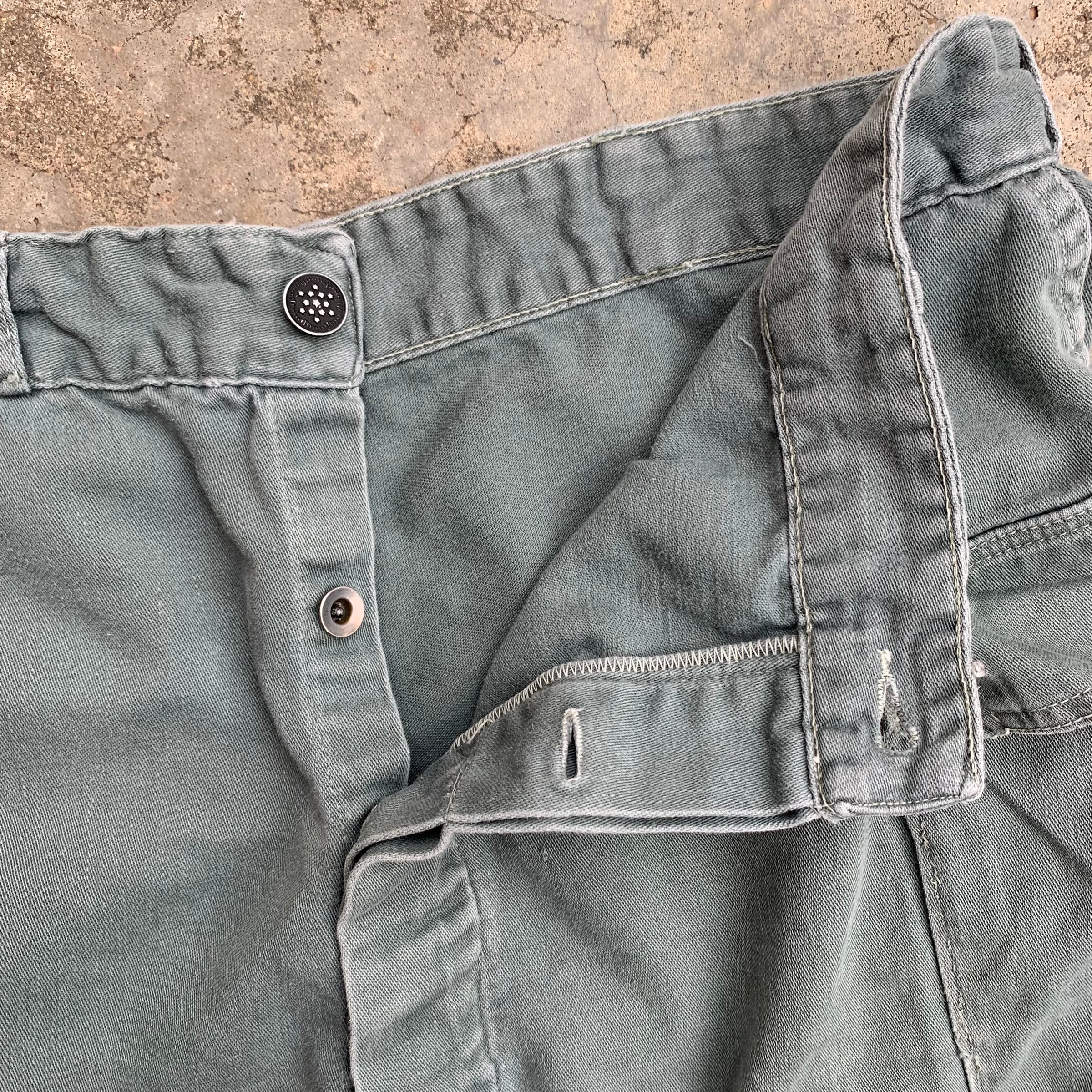 These are a pretty odd pair. 13 star buttons, donut buttons on fly, same cut as 2nd pattern wwii army fatigues but are in a sage green cotton like 50’s USAF Utility fatigues. Can’t discern age outside of either 40’s or 50’s. Very sweet though. Full cut, high rise. High rise counteracts the shorter inseam some, will feel like a 27” inseam when worn. Picture of back rise isn’t of a hole, the outer seam has come partially undone but still shut. Check pictures and measurements before purchase.