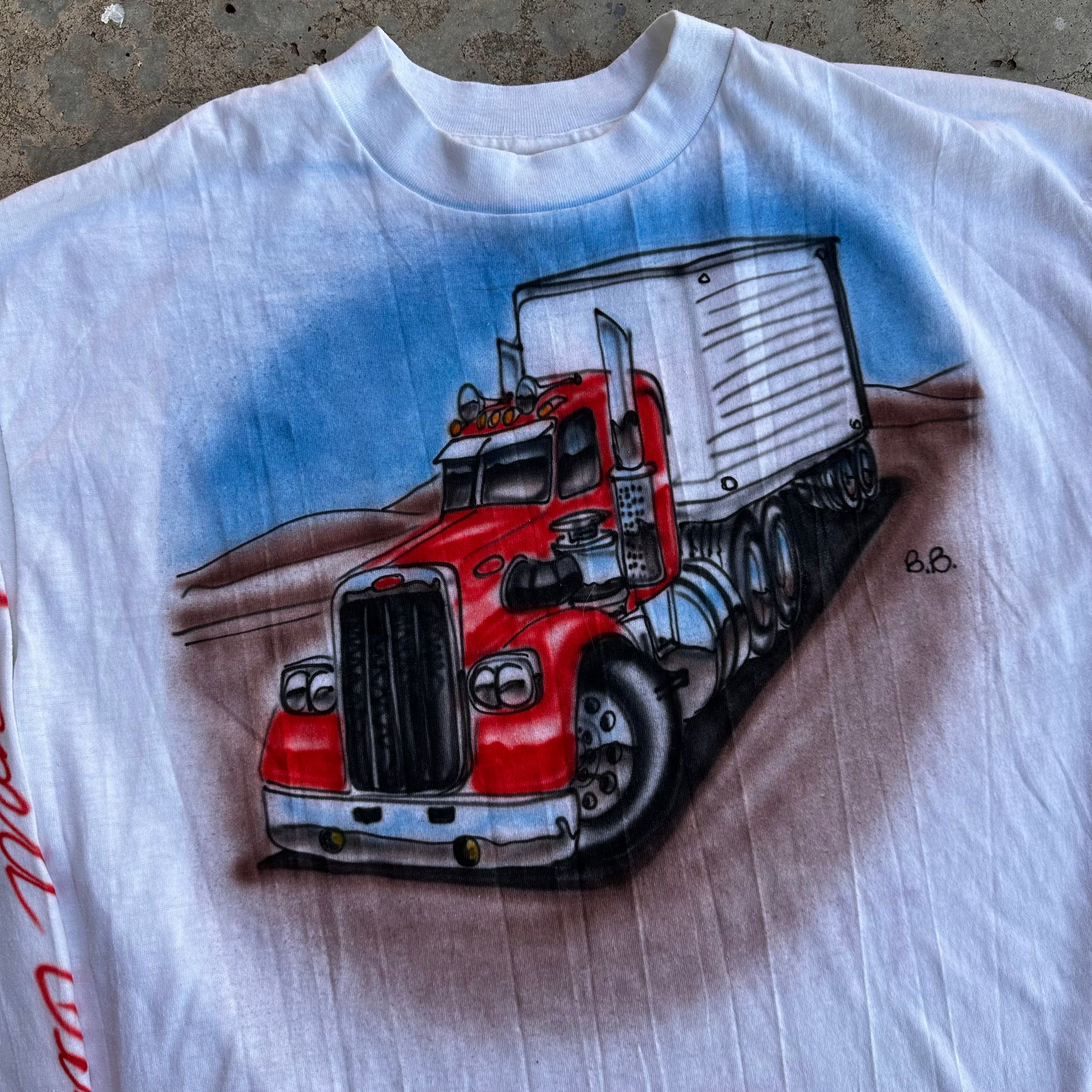 Never been washed, feels deadstock/mint. Incredible airbrush of an 18 wheeler. Tagged XL, fits like a large. Check pictures and measurements before purchase.
