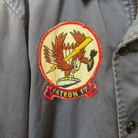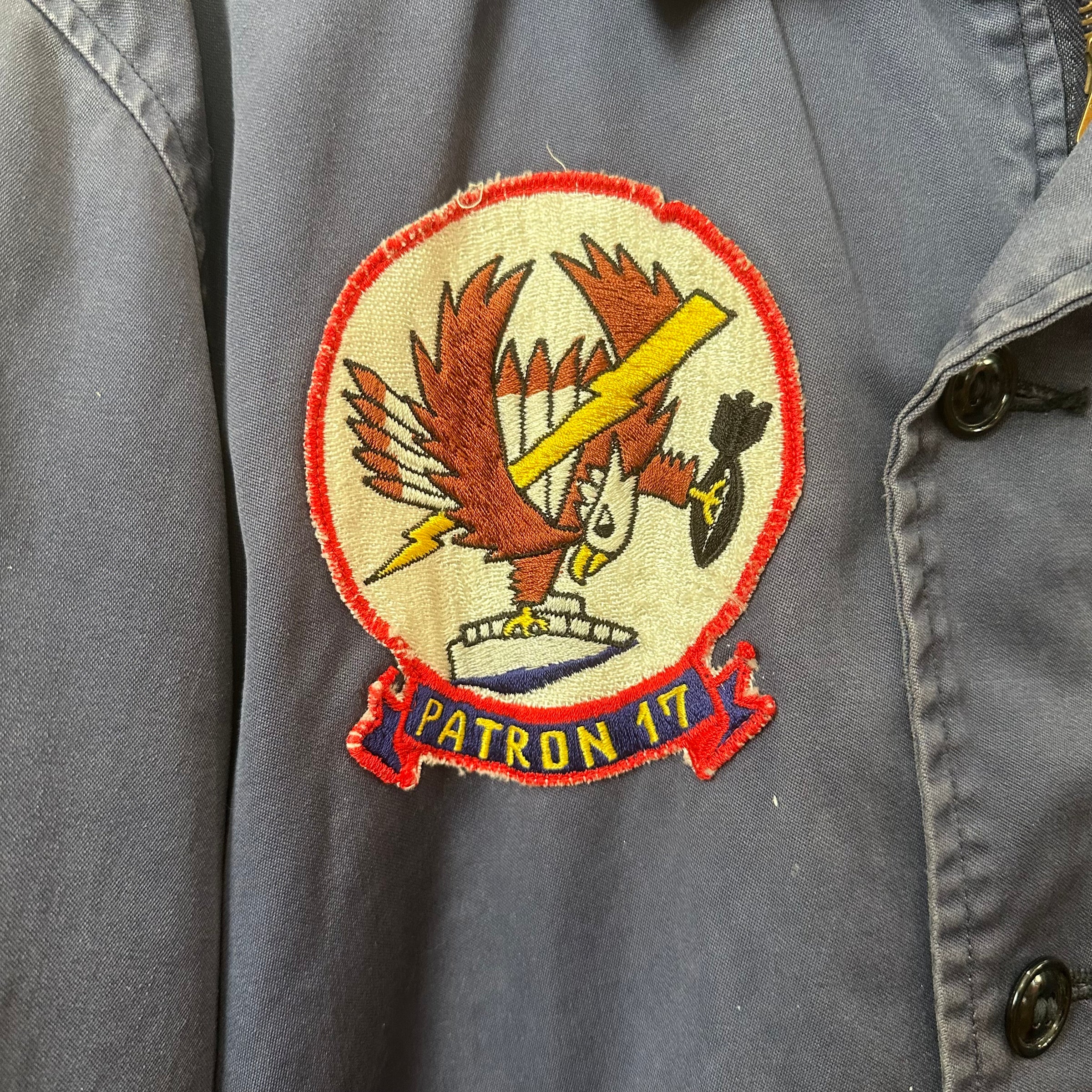 Dated 71. Patched to a naval airman in Patrol Squadron 17, nicknamed White Lightning. Most incredible patches I’ve had on one I’ve owned. Tagged size 38. Check pictures and measurements before purchase.